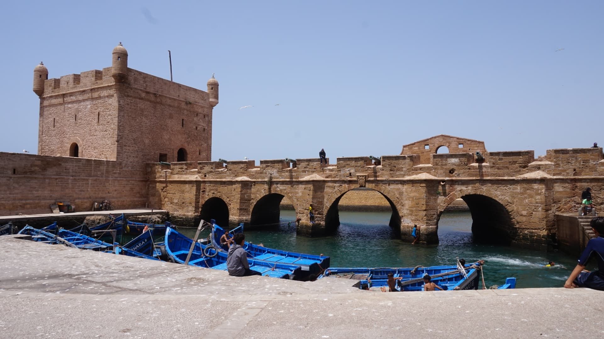 Abbiamo iniziato la nostra passeggiata tra le mura fortificate della medina, oggi patrimonio UNESCO, e ci siamo dirette subito verso una delle zone più scenografiche: la Skala de la Ville, la famosa terrazza panoramica punteggiata da cannoni affacciati sul mare. È il luogo perfetto per scattare foto, respirare l’aria oceanica e osservare la potenza delle onde che si infrangono sugli scogli. Da lì si scende verso il porto, dove barche blu ondeggiano nel caos ordinato dei pescatori e dei gabbiani, in uno dei panorami più iconici di tutta la Costa Atlantica marocchina.