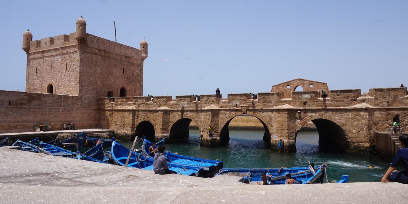 Abbiamo iniziato la nostra passeggiata tra le mura fortificate della medina, oggi patrimonio UNESCO, e ci siamo dirette subito verso una delle zone più scenografiche: la Skala de la Ville, la famosa terrazza panoramica punteggiata da cannoni affacciati sul mare. È il luogo perfetto per scattare foto, respirare l’aria oceanica e osservare la potenza delle onde che si infrangono sugli scogli. Da lì si scende verso il porto, dove barche blu ondeggiano nel caos ordinato dei pescatori e dei gabbiani, in uno dei panorami più iconici di tutta la Costa Atlantica marocchina.
